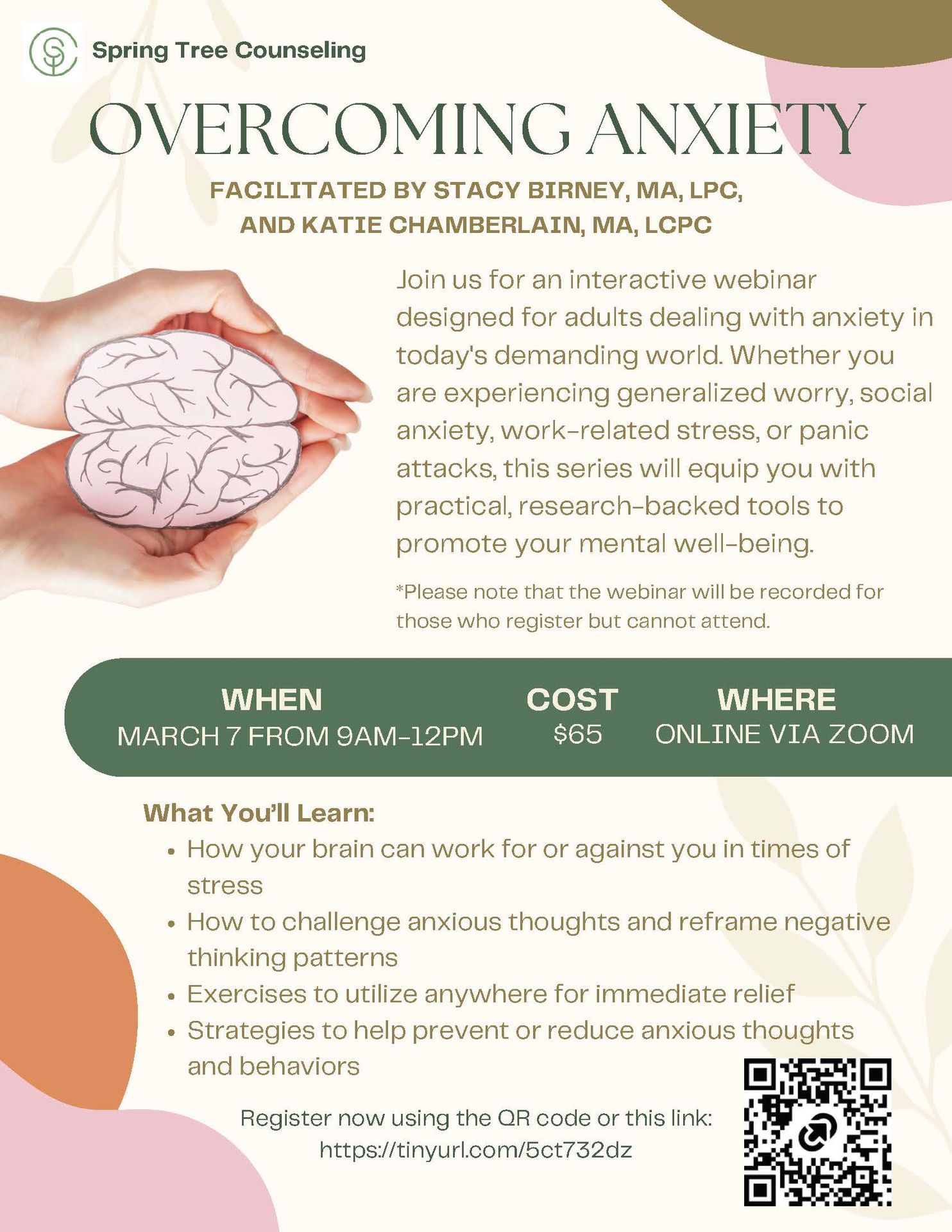 Join us for an interactive webinar series designed for adults dealing with anxiety in today's demanding world. Whether you are experiencing generalized worry, social anxiety, work-related stress, or panic attacks, this series will equip you with practical, research-backed tools to promote your mental well-being.