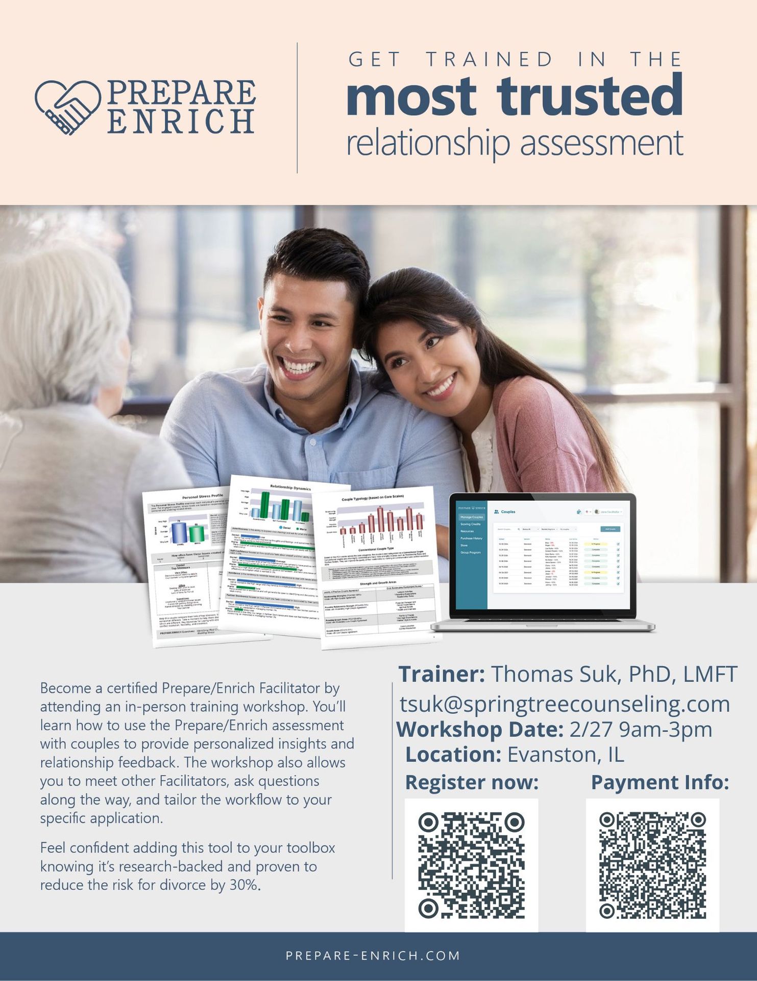 Join Dr. Thomas Suk, PhD, LMFT for an in-person training event that will equip you with the skills and confidence to effectively implement the Prepare-Enrich couple relationship survey. This review of couple relationship styles can be used with couples of all ages and relationship stages. Prepare-Enrich assesses a couple’s strength and growth areas and engages them in conversation to improve their relationship.